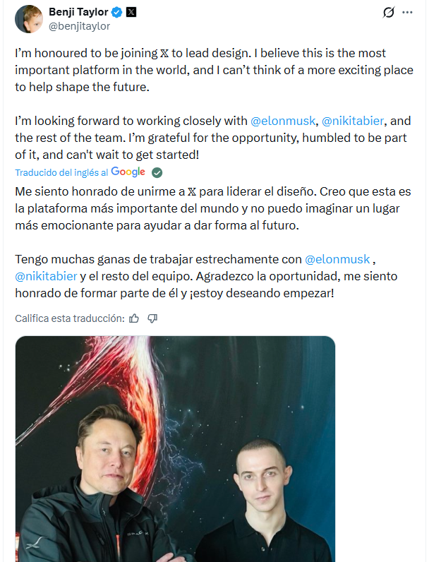 El propio Taylor confirmó su llegada con un mensaje publicado ayer, 25 de marzo, en su cuenta personal de X: “Me siento honrado de unirme a X para liderar el área de diseño. Creo que es la plataforma más importante del mundo y no puedo imaginar un lugar más emocionante para ayudar a construir el futuro”.