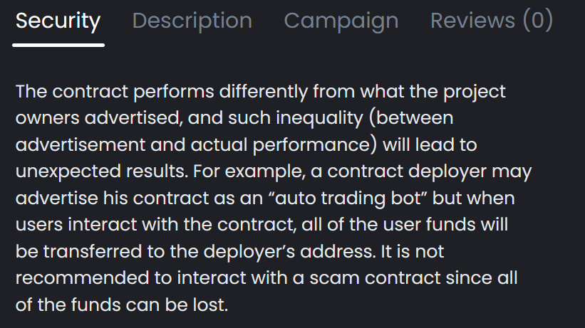 La auditoría de HazeCrypto dice que el contrato inteligente BNB Beats no tiene vulnerabilidades. Sin embargo, la auditoría advierte que los fondos depositados no se pueden retirar y que los dividendos de usuarios viejos se pagan a partir de los depósitos de nuevos usuarios —la definición de libro de texto de una estafa del tipo "Esquema Ponzi".