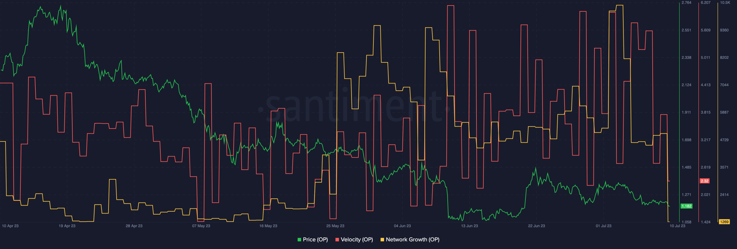 En cuanto al token OP, el precio del token era de $ 1,1215 en el momento de la publicación. El precio disminuyó significativamente durante el último mes, junto con su velocidad. Esto indicó que la frecuencia con la que se negociaba OP había disminuido.