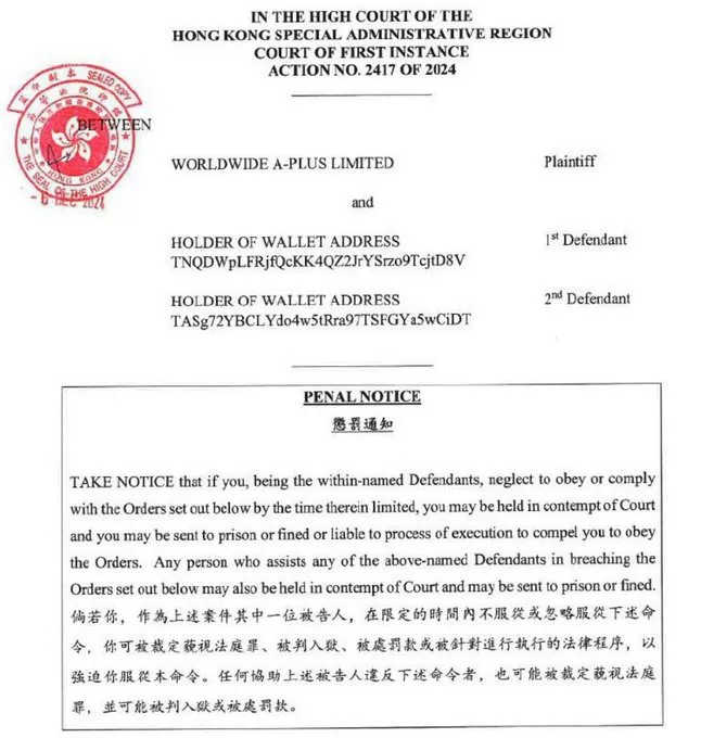 La orden del Tribunal Superior de la Región Administrativa Especial de Hong Kong también nombra a los titulares de las direcciones de billetera TNQDWp y TASg72Y como demandados en la demanda. Afirma que el incumplimiento de la orden judicial equivale a desacato al tribunal.