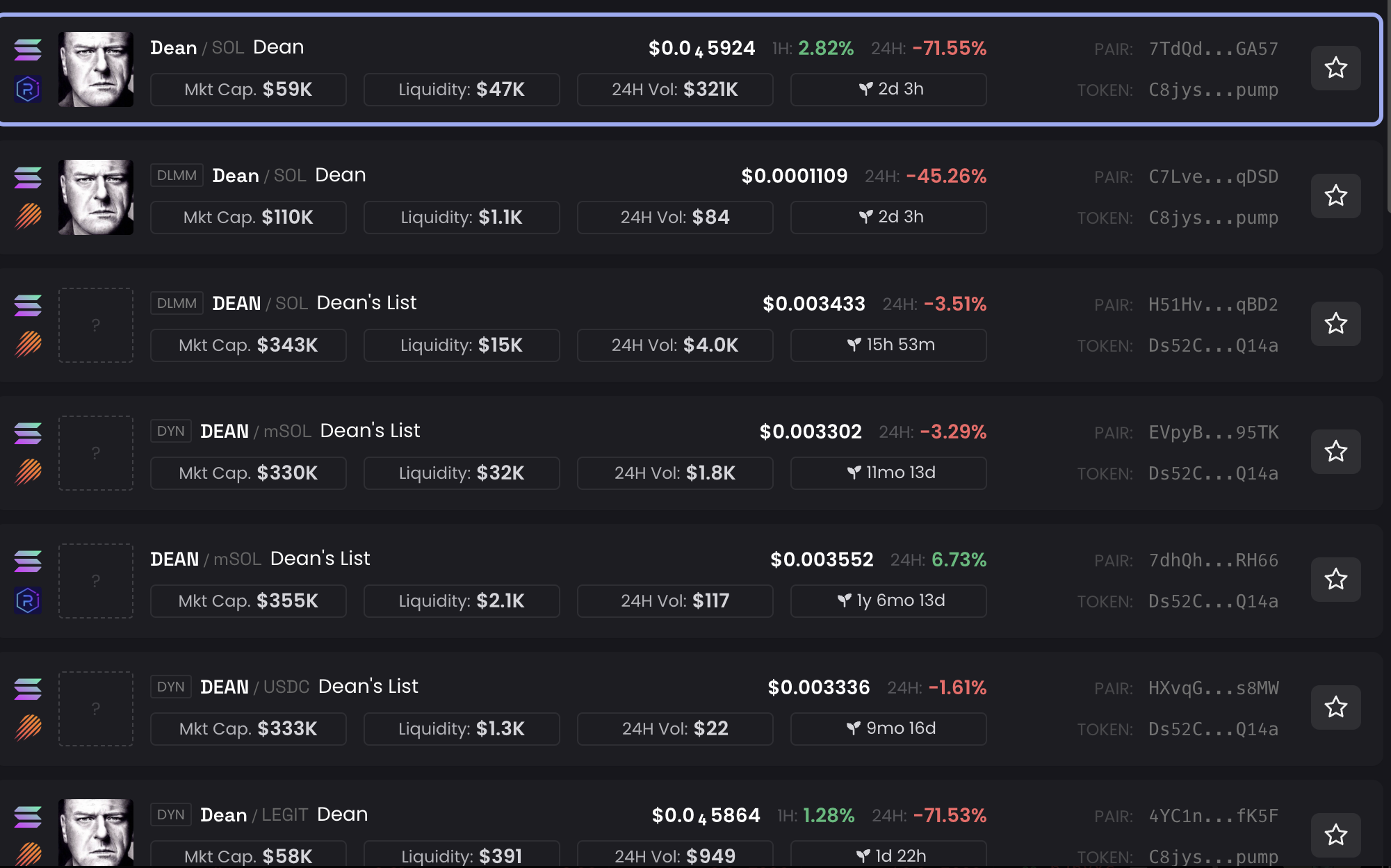 Al momento de informar, varios memecoins DEAN—algunos con solo uno o dos días de antigüedad—seguían disponibles para trading en el mercado.