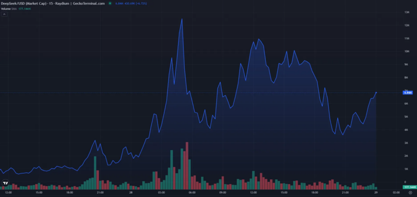 Seek, el primer token falso de DeepSeek, se lanzó. Logró acumular una capitalización de mercado de 48 millones de dólares antes de desplomarse. Este primer rug pull fue tan exitoso que los estafadores lanzaron otro. Una memecoin basada en Solana se negoció bajo el nombre “DeepSeek” y alcanzó una capitalización de mercado de más de 12 millones de dólares.