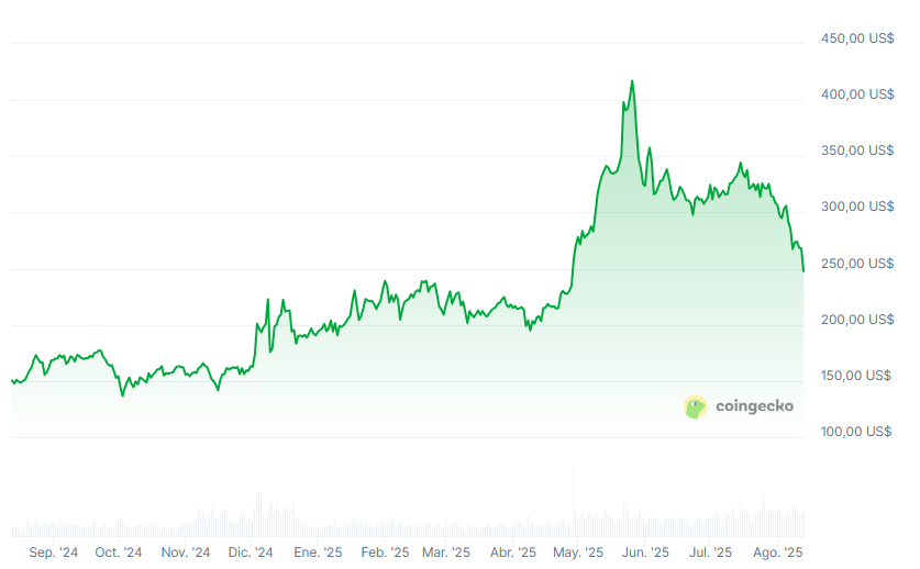 El precio de monero (XMR) va fuertemente a la baja. Al momento de esta publicación, cada XMR se comercia por 247 dólares, lo que representa una caída superior al 17% en la última semana.