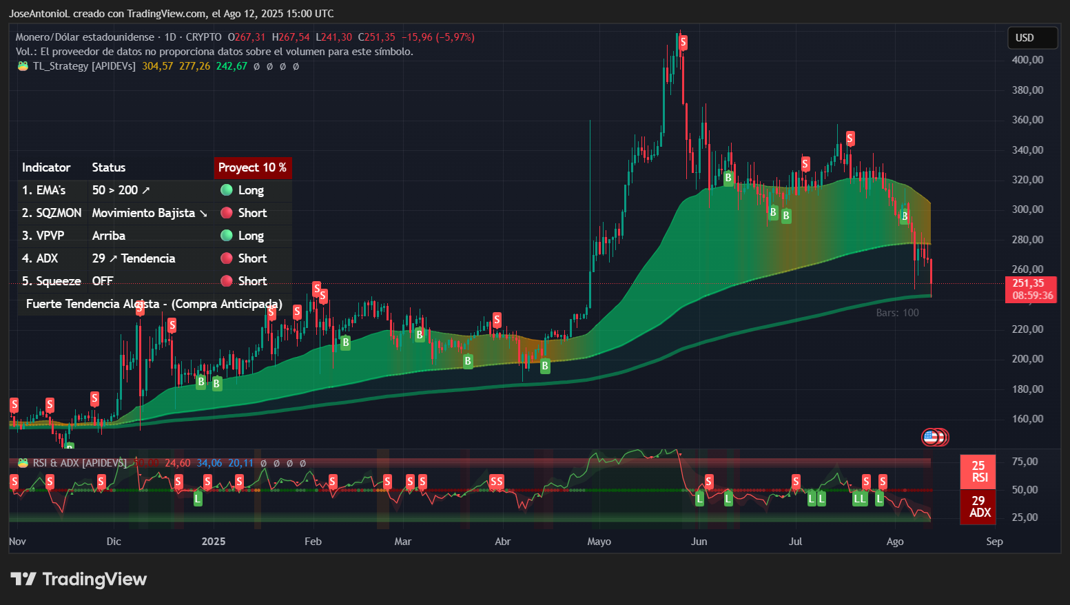 El panorama técnico para Monero pinta un escenario claramente bajista en múltiples marcos temporales. La acción actual del precio en $251,35 parece ser una ruptura decisiva por debajo de niveles críticos de soporte, con indicadores de impulso que confirman que es probable que la presión de venta continúe. La moneda ha bajado un 15% en la última semana y más de un 6% en las últimas 24 horas.