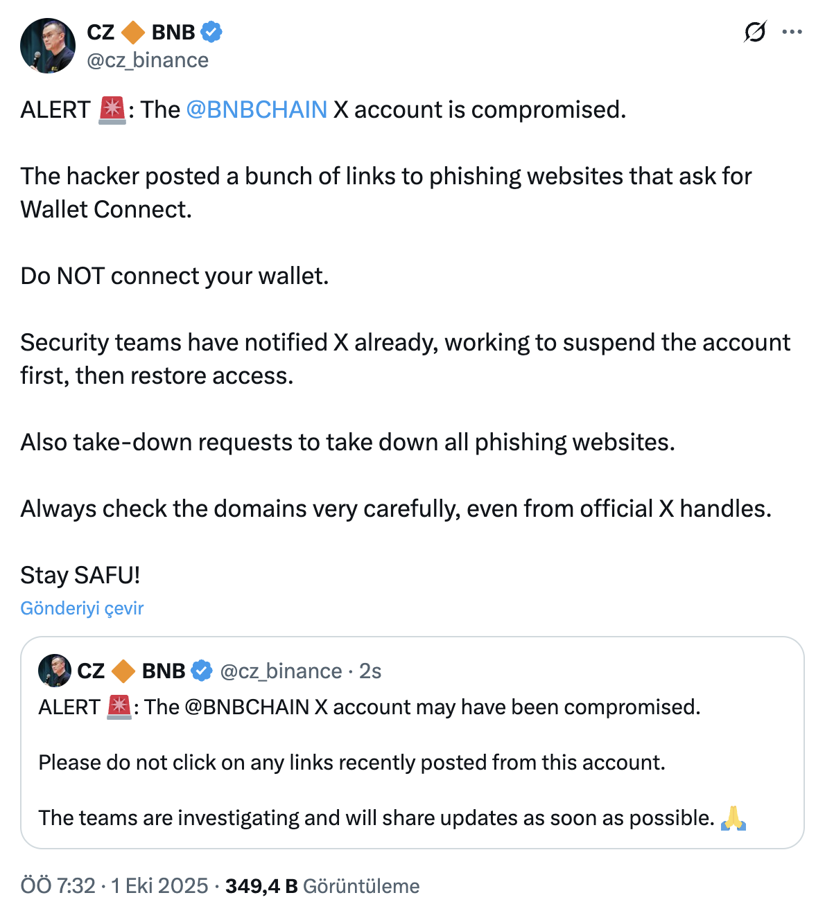 Los enlaces compartidos por los hackers apuntaron a inversores a través de operaciones de vinculación de carteras. El equipo de seguridad de BNB Chain declaró que está comunicándose con X para recuperar el acceso a la cuenta y eliminar los enlaces a sitios fraudulentos. Durante este tiempo, se aconsejó a los inversores no hacer clic en ningún enlace ni conectar sus carteras.