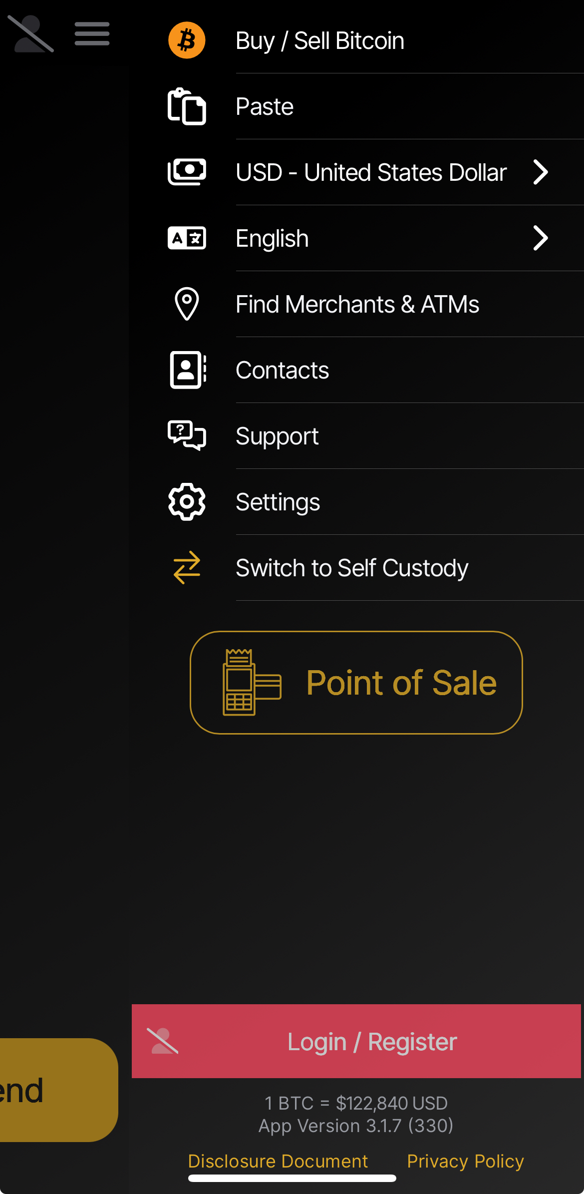 Para activar esa nueva modalidad, tras descargar la aplicación o actualizarla a la versión más reciente, desde la interfaz inicial se debe abrir el menú de las tres rayitas grises y seleccionar la opción “switch to self-custody» (cambiar a autocustodia), como se ve en la siguiente imagen: