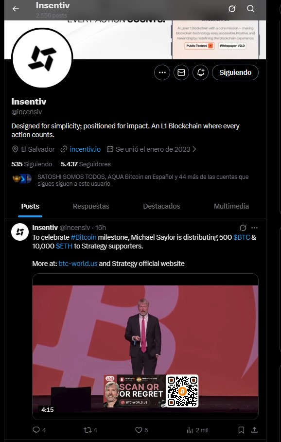En la plataforma, el usuario @Asobitcoin fue eliminado, así como toda la información referente a esa organización. En su lugar, se cambió el nombre a una supuesta entidad llamada «Insentiv», bajo el nombre de usuario @incensiv. Esta se presenta como una «blockchain de capa 1», sin embargo, esta cuenta es falsa.