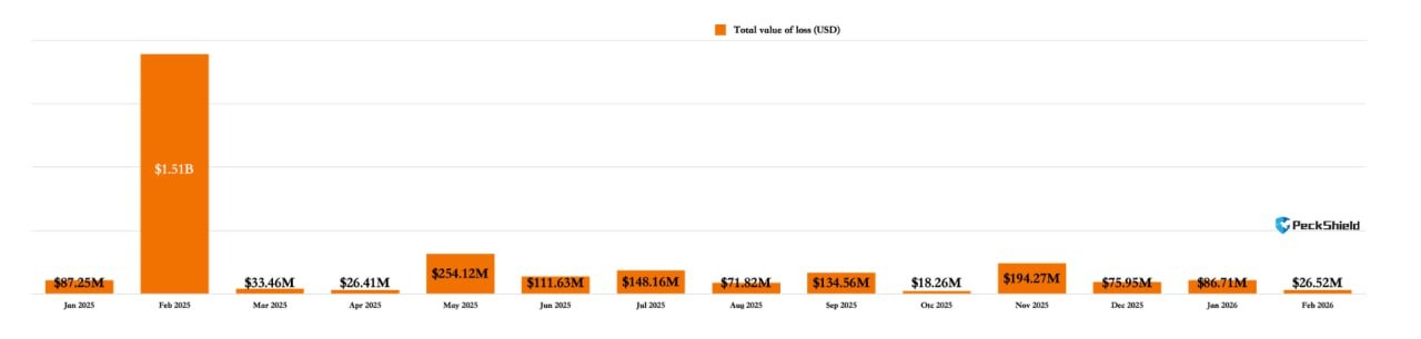 Los hackeos y estafas de criptomonedas provocaron pérdidas valoradas en 26,5 millones de dólares en febrero, la cifra mensual más baja desde marzo de 2025, según la empresa de seguridad blockchain PeckShield.