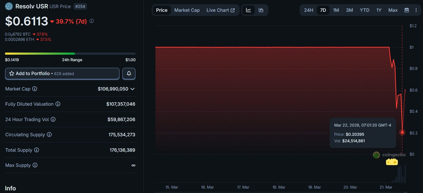 - La presión de venta llevó a USR a desplomarse en algunos mercados hasta USD $0,025 antes de una recuperación parcial.
