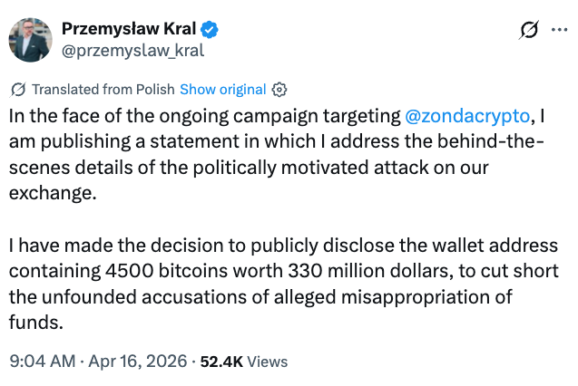 El CEO negó previamente las afirmaciones de insolvencia tras la investigación de la hot wallet por parte de Recoveris el 6 de abril, insistiendo en que Zonda permanecía completamente solvente con más de 4.500 $BTC en tenencias.