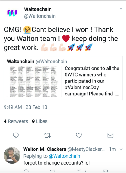 For the curious reader, the "OMG! 😭Cant’t believe I won! Thank you Walton team ! ❤️ keep doing the great work. 💪🏼💪🏼💪🏼🚀🚀🚀" emojifull sentence is acquiring now cult status after the Twitter account of the project sent out a message with the aforementioned characteristics to its 50K + followers. Although the tweet was obviously deleted, someone got the screenshot: