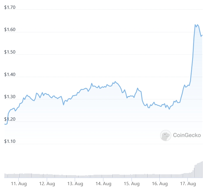 Meanwhile, EOS jumped today. At 13:15 UTC, the 45th coin by market capitalization was trading at USD 1.53, up 19% in a day and 30% in a week. It's also up 55% in a month and down 72% in a year.