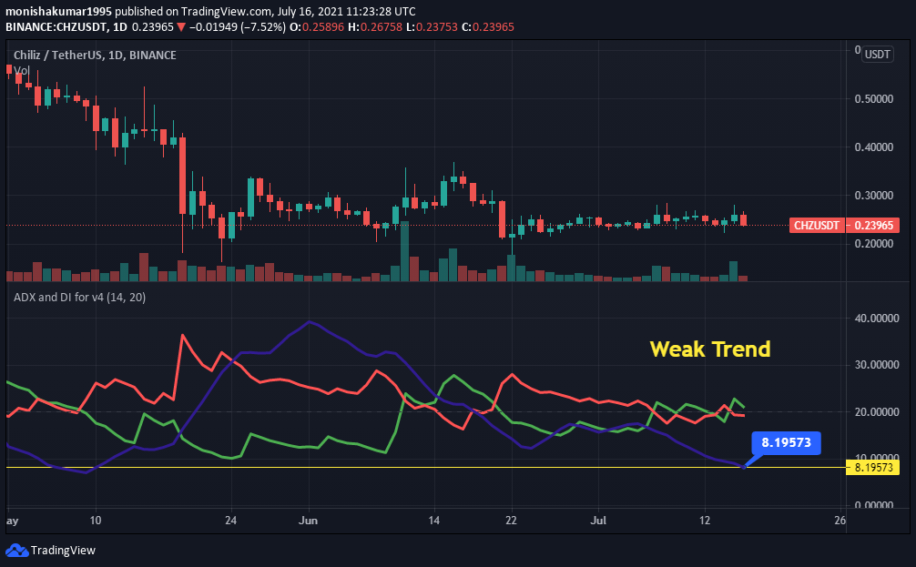 Now let’s look at the average directional index (ADX) of CHZ. Generally, ADX helps traders determine the strength of a trend, rather than its actual direction. It can be used to determine whether the market is changing or a new trend is beginning. However, it is linked with the Directional Movement Index (DMI).
