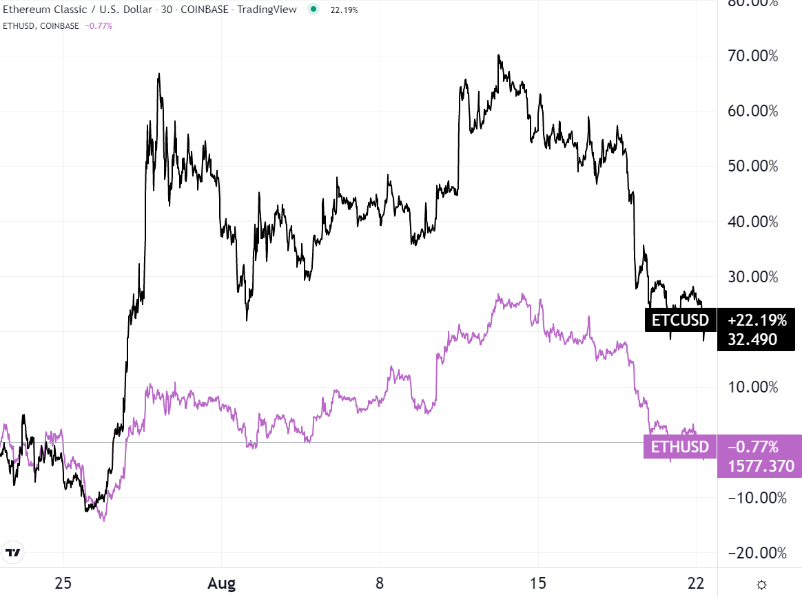 Year-to-date, ETC outperformed ETH by +65%. In the last 30 days, the ETH/ETC dynamic has been especially volatile, owing to the Merge date ending closer.