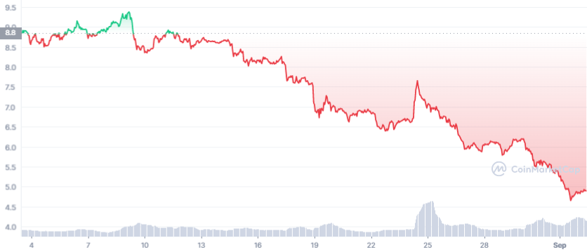 The above chart shows the last thirty days’ price drop of HNT from August 3 to till date. However, the current price of HNT is $4.89 USD with 0.53% down in the last 24 hours.
