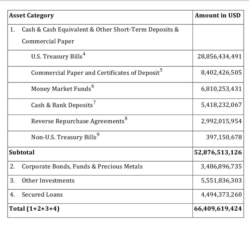 The reserve is equivalent to the value of USDT the firm had in circulation at the time, which totaled $66.41 billion. Paolo Ardoino, the Tether CTO, said commercial paper holdings have since declined to $50 million and U.S Treasury bills now account for nearly 60% of reserves.