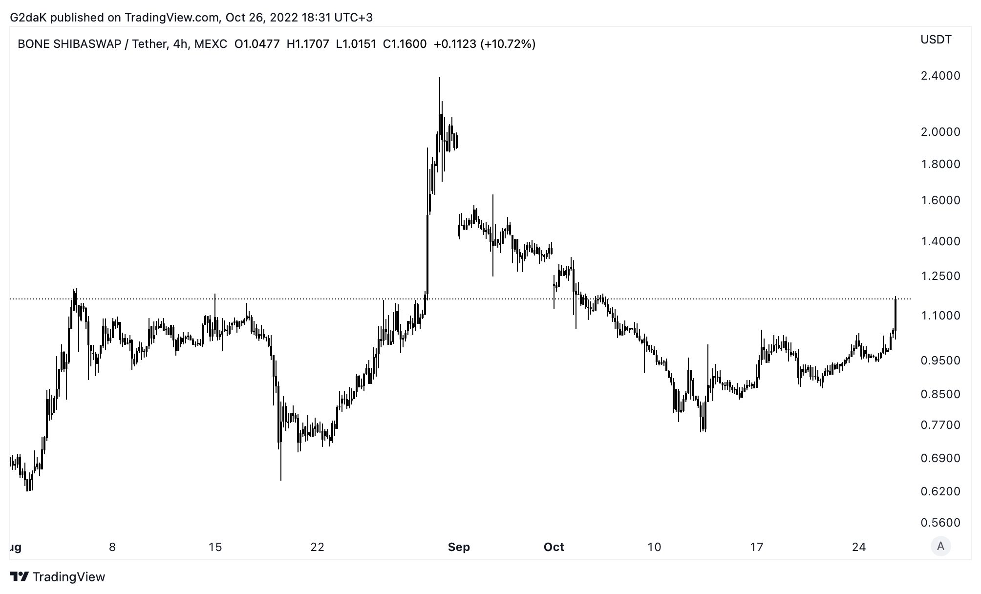 BONE has now reached $1.16, where it had previously shown two opposing performances. So for the first time, BONE quotes drew a figure at these levels, which can be compared with Bart Simpson's hairstyle. For the second time, however, at the end of August, BONE rose from this zone by 106% to reach its all-time high of $2.4.