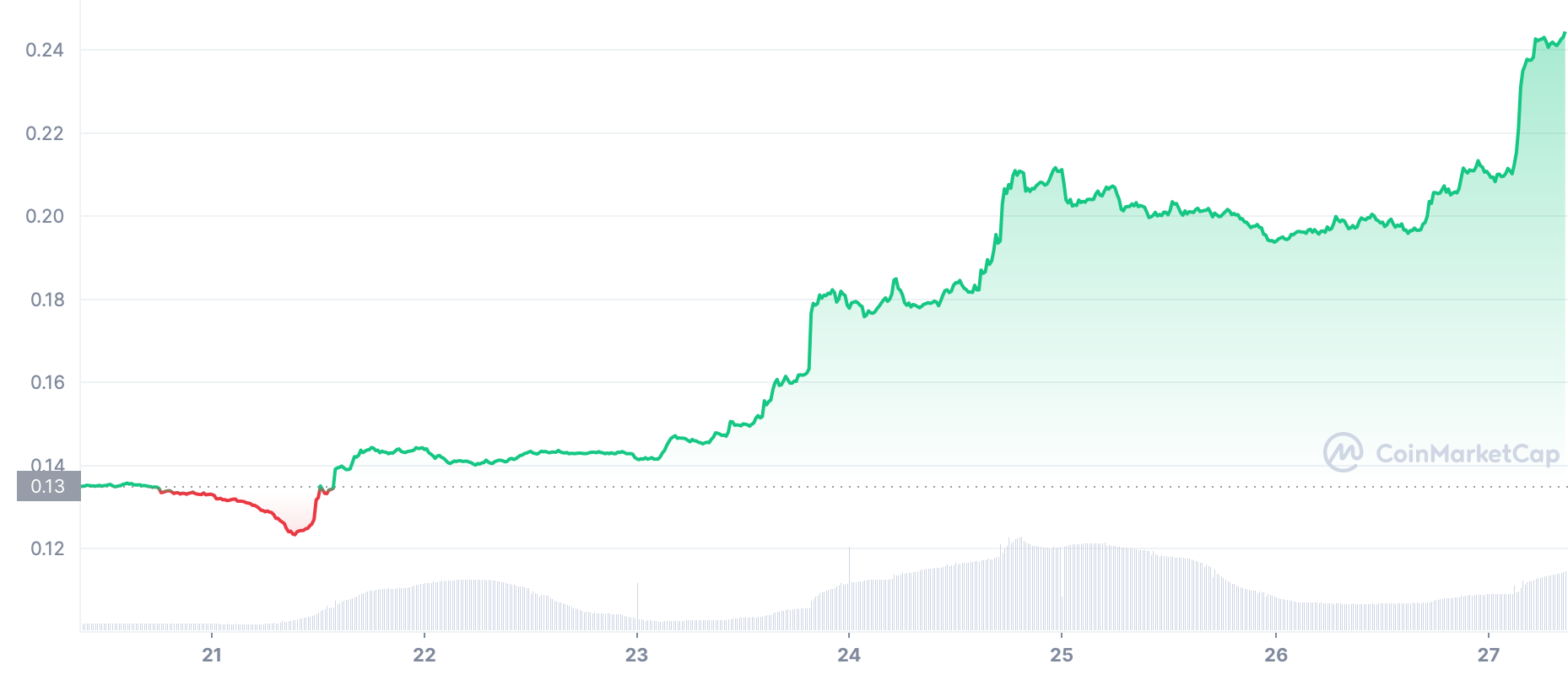The culprit for the "failure" of the father of all memecoins was the price action of KLAY token from Klaytn project, which showed growth of 25% in the last 24 hours. While DOGE could still compete in profitability here, in the last seven days, KLAY has outperformed Dogecoin by 33%, given that the latter rose by an already colossal 44%.