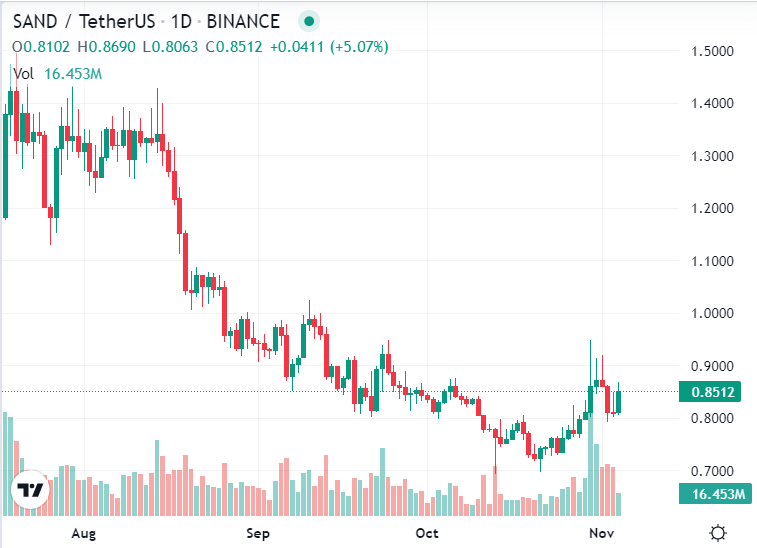 According to CoinMarketCap, SAND is currently trading at $0.8522 after a 0.76% increase in price over the last day. In addition to this, the utility token is also up more than 10% over the last week. SAND did, however, weaken against Bitcoin (BTC) and Ethereum (ETH) by about 0.36% and 0.89% respectively.