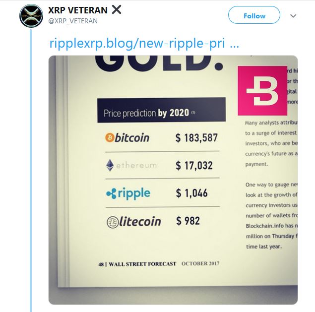 He pointed at an article he found on Twitter, where Wall Street Journal reportedly forecast XRP would reach $1,000 by 2020. The forecasts, which were made in October 2017, stressed that Bitcoin, Ethereum and Ripple’s XRP would reach $183,000, $17,000, and $1,000 respectively by January 1st 2020.