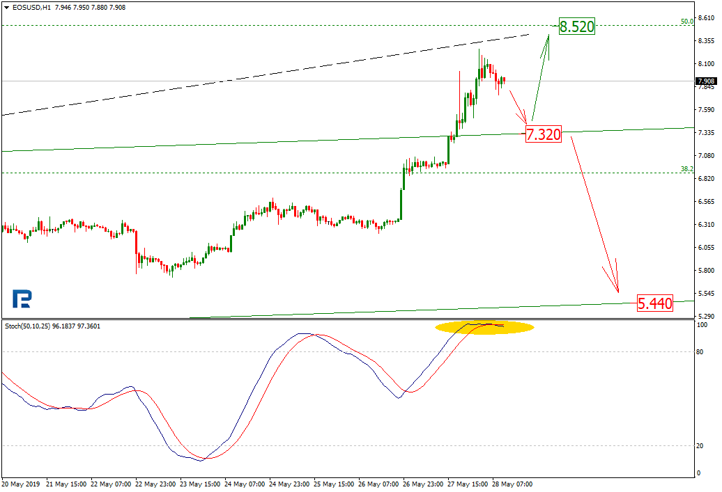 On H1, the Stochastic formed a black cross in the overbought territory, which may signal the price could be taken to $7.32. However, after testing it, the price may well rise to $8.52.