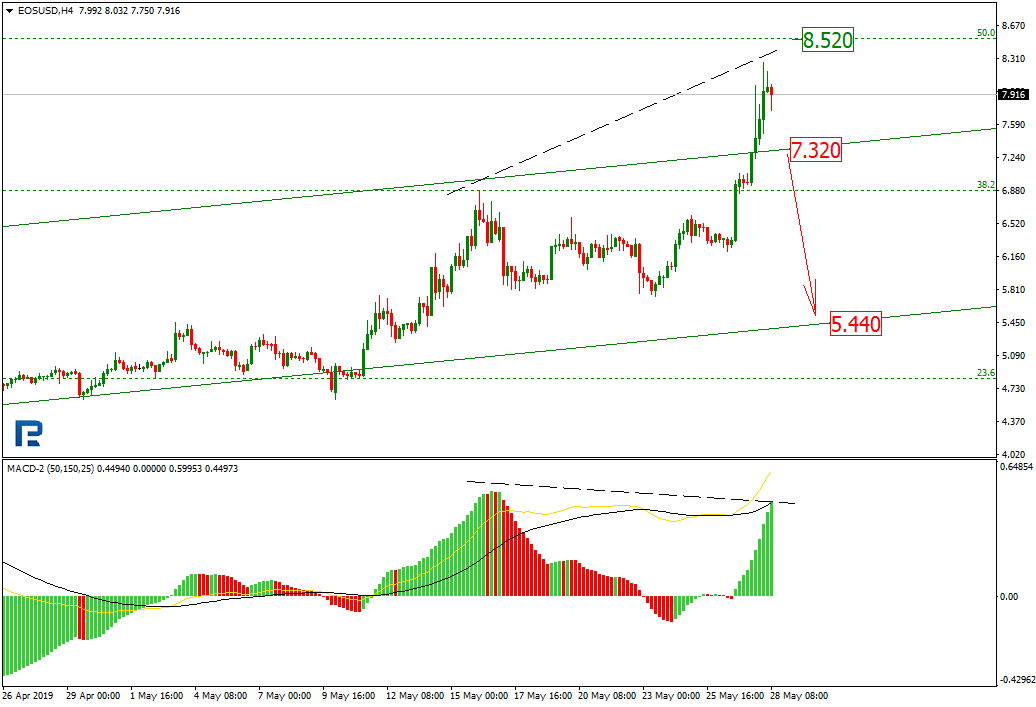 The steady uptrend, however, is still going on. On H4, the price got boosted and broke out the previous channel boundary at 50% Fibo, or $8.52. The MACD, meanwhile, is diverging, which may signal a reversal. Therefore, once the target at $8.52 is reached, the price may hit the local support at $7.32, and then, after breaking it out, head further down to $5.44, the previous ascending channel support.