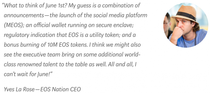 EOS appears to be heating up following the news that there will be a major announcement scheduled for June 1.