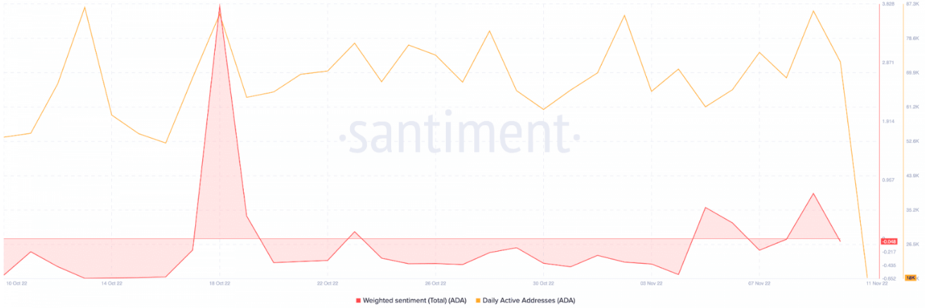 Weighted sentiment for ADA and the Cardano network remained negative throughout October, which implies that the crypto community had more negative than positive comments and mentions about the network on social media platforms.