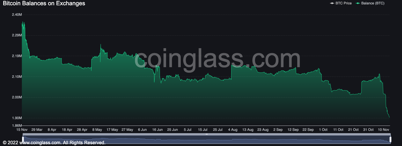 According to data from Coinglass, the Bitcoin balance on centralized exchanges plummeted 10% from 2.11 million on November 7 to just above 1.9 million today.