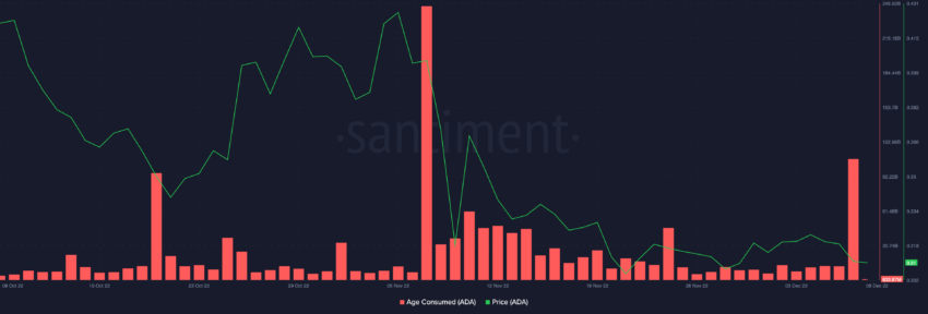 The recent spike in Age Consumed could lead to higher market volatility, pushing prices in either direction. Before this surge, ADA saw another Age Consumed spike on Nov. 5, which led to a bearish pullback for ADA price.