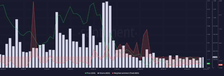 The spot market price action for Cardano is still bearish. Daily trade volumes had flatlined, presenting no major push or interest from retailers. In addition to that, the weighted sentiment is still in the negative territory showing no-to-low demand for Cardano.