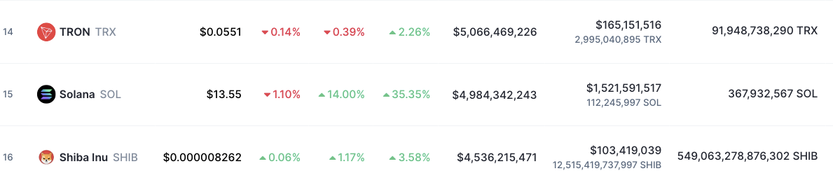 Solana is now ranked 15th on the list of the top 20 cryptocurrencies, as shown by the prominent cryptocurrency reference portal CoinMarketCap. The Shiba Inu has dropped one position and is now ranked 16th, while the TRX from Tron is in 14th place.