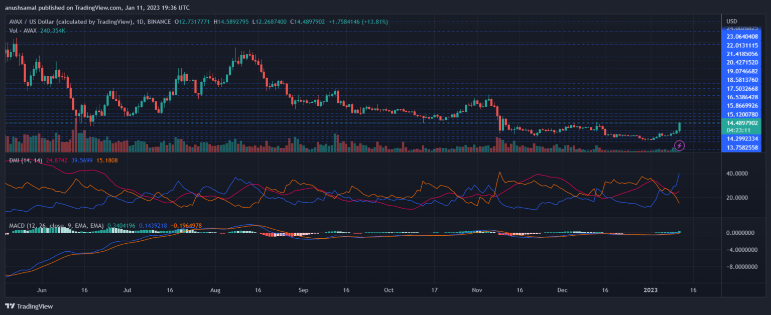 This has made the coin break past the $13.60 resistance level, and now AVAX is valued at $14.40. It is yet to be seen if the coin manages to breach the $15 mark, acting as a resistance mark for the coin. A fall from the current price will bring the altcoin down to $13.70.