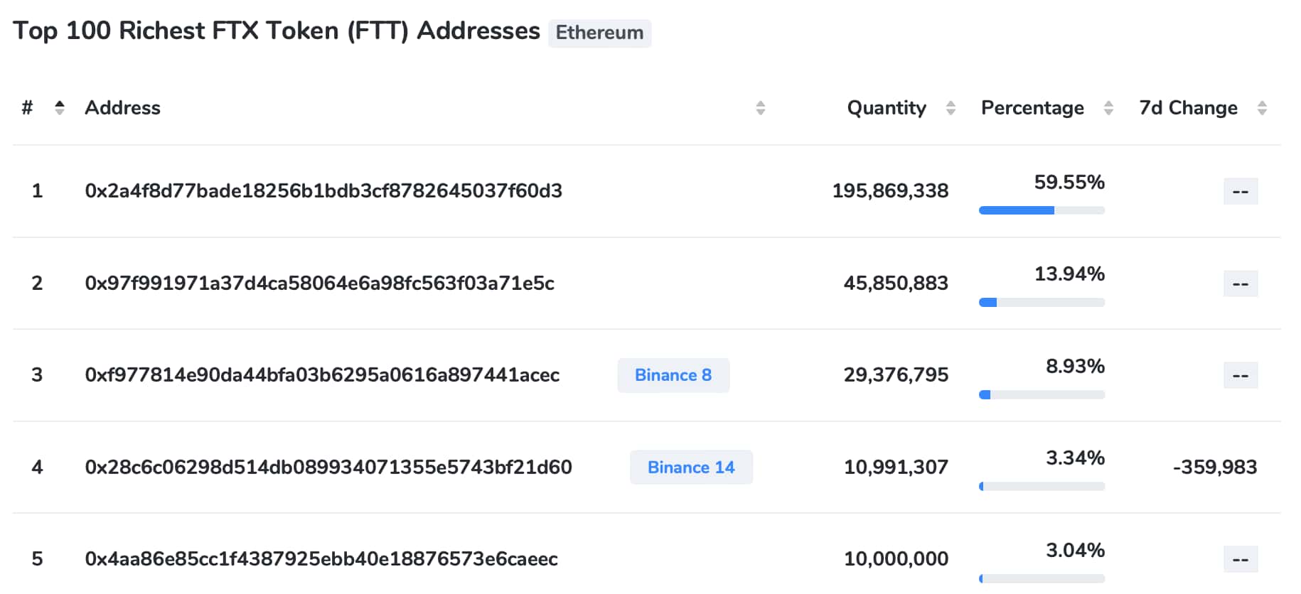 One address controls 59.55% of the total FTT supply, contributing to the extraordinarily high levels of ownership concentration. Furthermore, an unidentified hacker has possession of 45.85 million FTT tokens, which accounts for 13.94% of the total quantity currently in circulation.