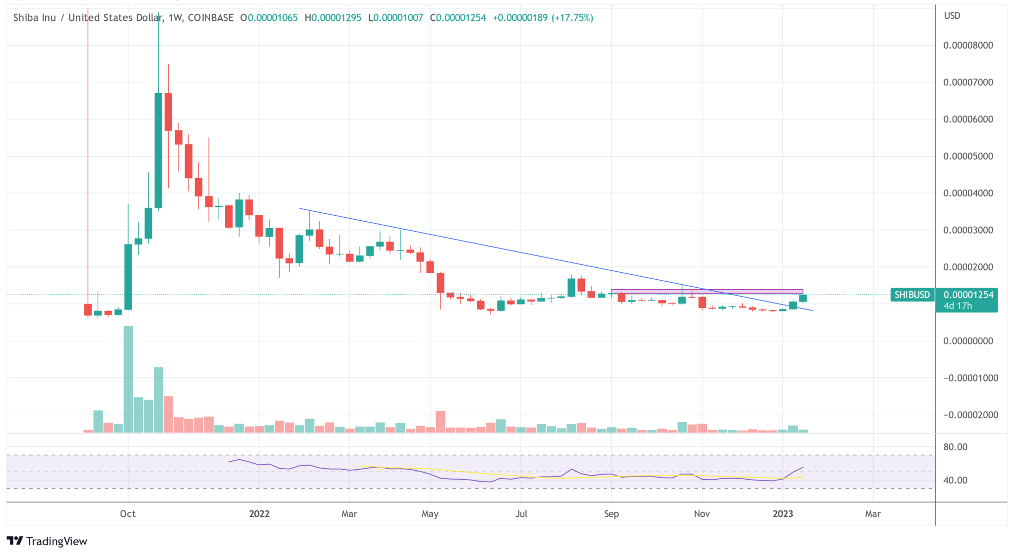 The 1-week chart shows that SHIB managed to break out of a one-year downtrend when the price broke the falling trendline to the upside last week. With the setup in the daily chart, a retest of this trendline might be possible to build further bullish momentum afterward.