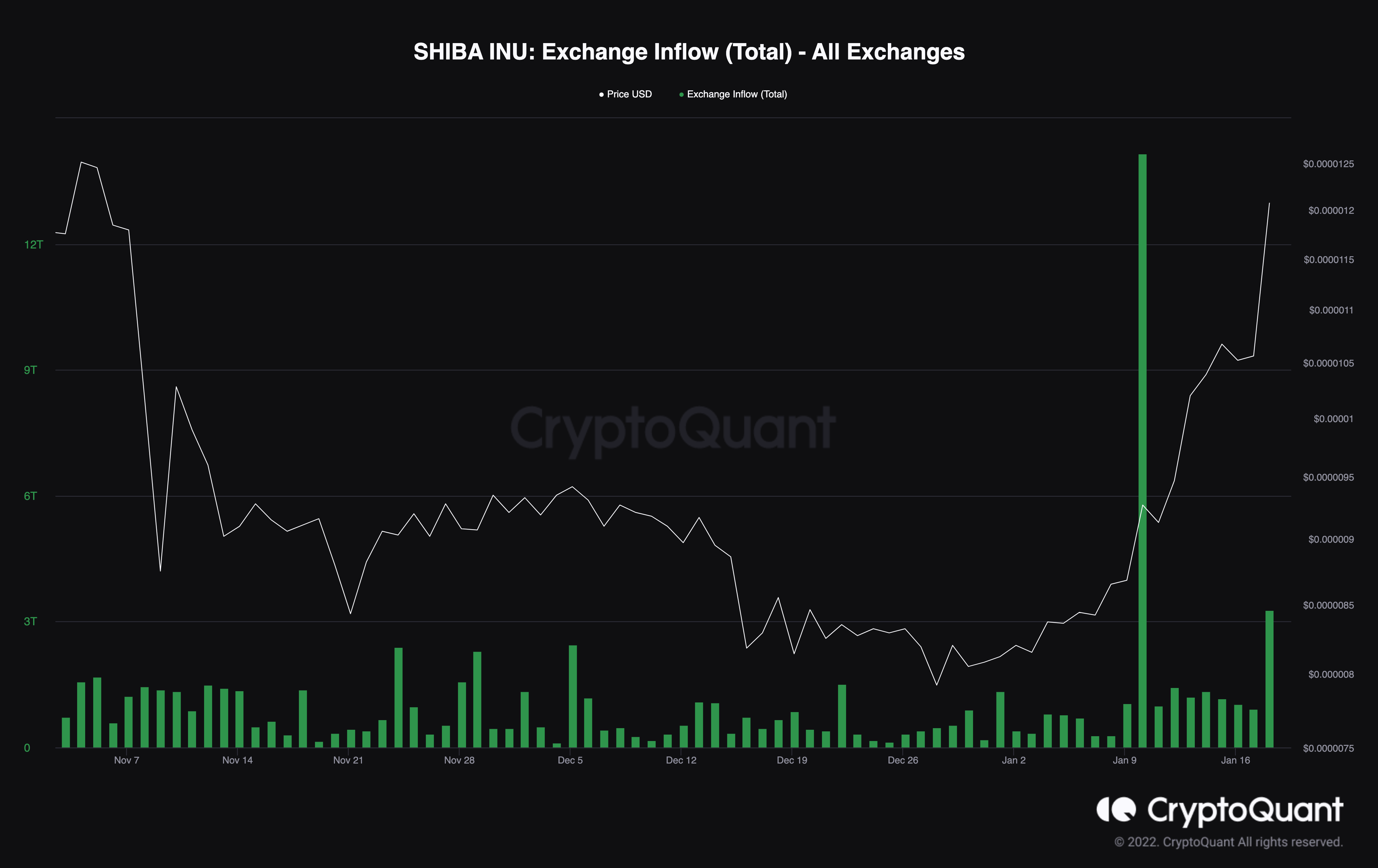 The amount of SHIB tokens being transferred to exchanges saw a massive spike on January 10, when over 14 trillion tokens were deposited on exchanges, according to data from CryptoQuant. In relation to today’s price rise, this would suggest that holdings may be being used to open derivative positions rather than being sold in the spot market.