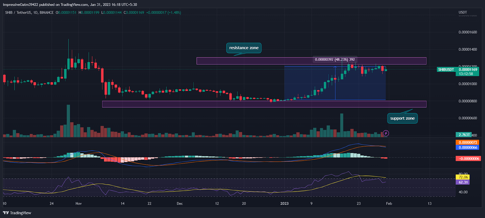 SHIB prices have risen by more than 45% in a month. The prices are retesting the resistance zone of 0.000012; if breached, a bull run may be established, reaching new highs. The RSI shows possible price reversal as sellers may participate in booking profits. MACD starts to record sellers gaining temporary dominance. Investors can trust the support zone near 0.0000075 to invest in SHIB and enjoy a price rocket near the Shibarium launch.