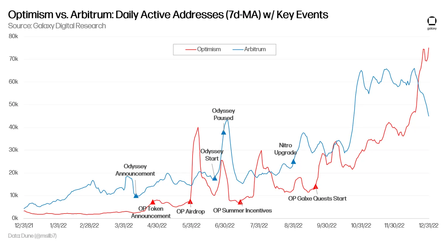The chart by Galaxy research shows Optimism surpassed Abritrum in terms of daily active users at the end of 2022. (Galaxy Research)