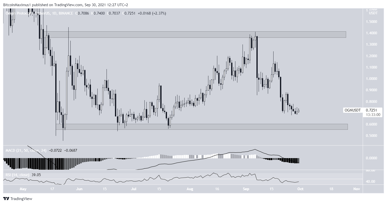 Since May 25, OGN has been trading inside a range between $0.58 and $1.40. Most recently, it was rejected by the $1.40 resistance on Sept 6 (Red icon) and has been decreasing since.