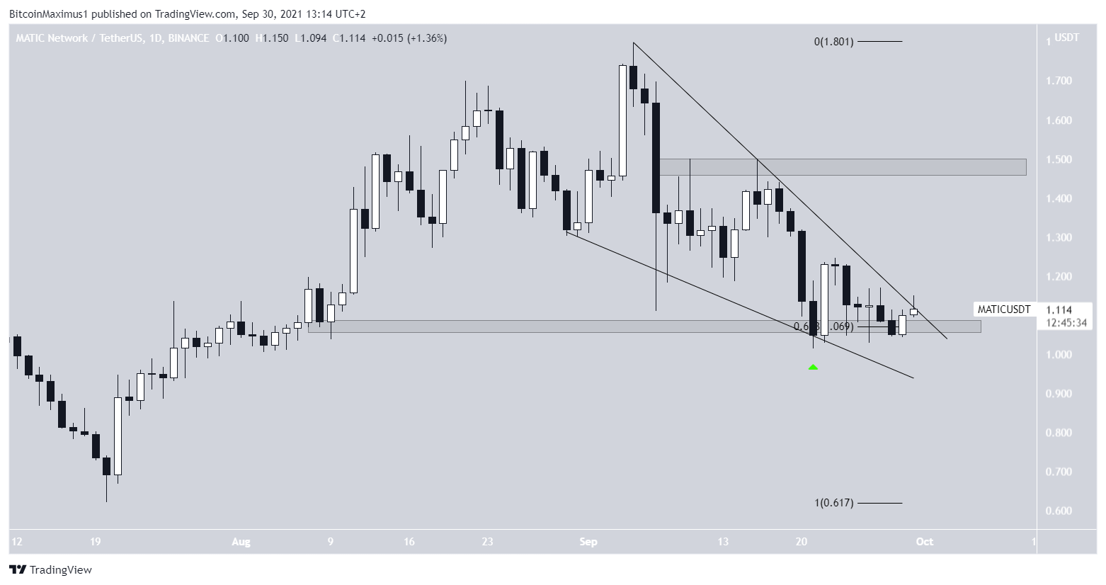 MATIC is trading inside a descending wedge, and has been doing so since Sept 5. On Sept 21, it bounced at the support line of the wedge and $1.06 support area. Afterwards, it created a double bottom and is in the process of breaking out.