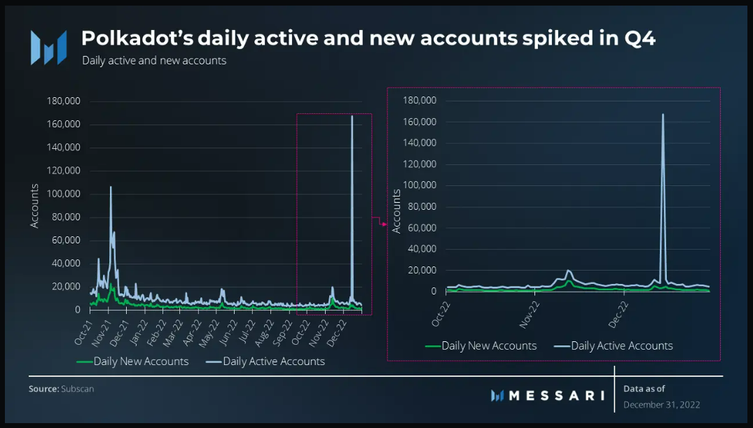 1/ The latest @MessariCrypto report into Polkadot is out. Among many other data points, it reveals daily active accounts increased by 64% and new accounts increased by 49% in Q4 2022.