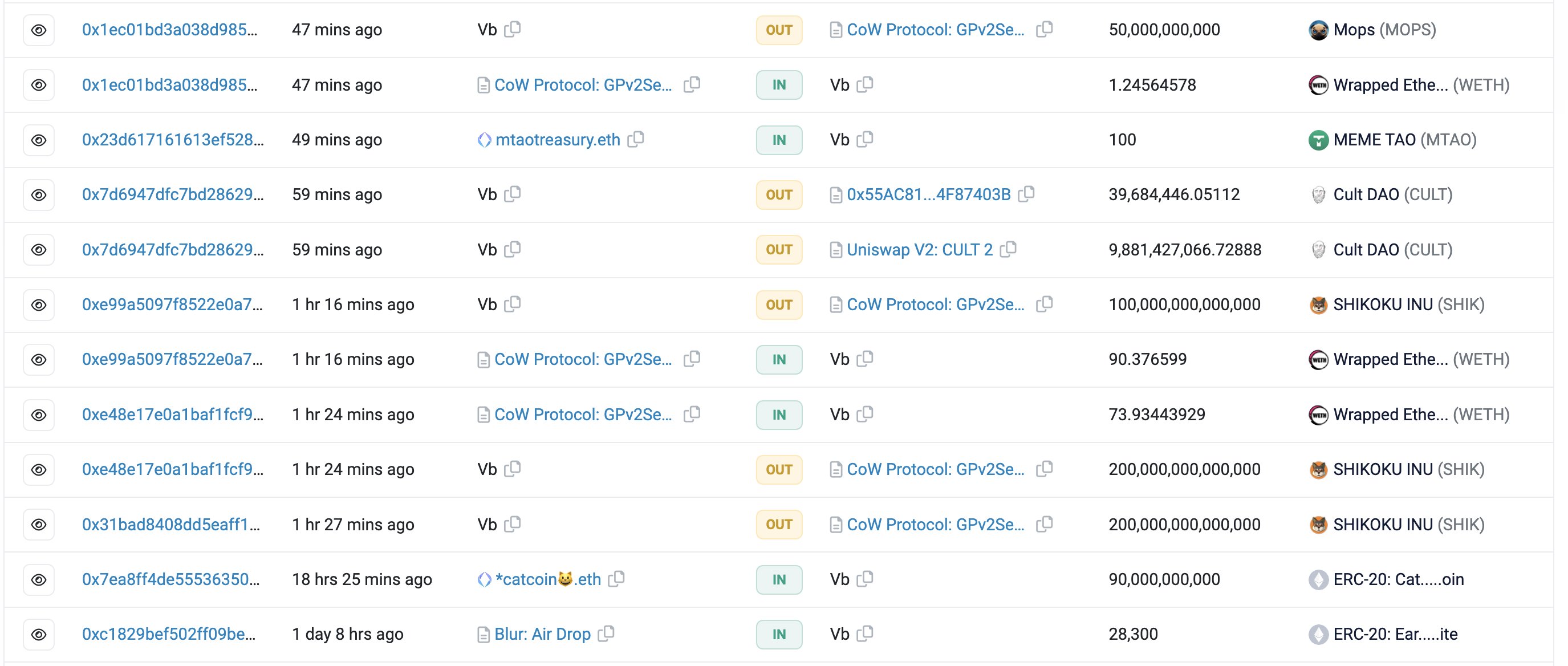 Currently sold 50billion MOPS for 1.25 $ETH($2K), sold 10bill CULT for 58 $ETH($91K), sold 500 trillion SHIK for 380 ETH($600K).”