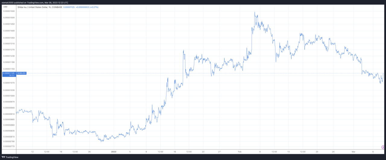 According to data from TradingView, currently (as of 12:23 p.m. UTC on March 8), $SHIB is trading at around $0.00001125, up 2.245% in the past 24-hour period and up 39.75% in the year-to-date period.
