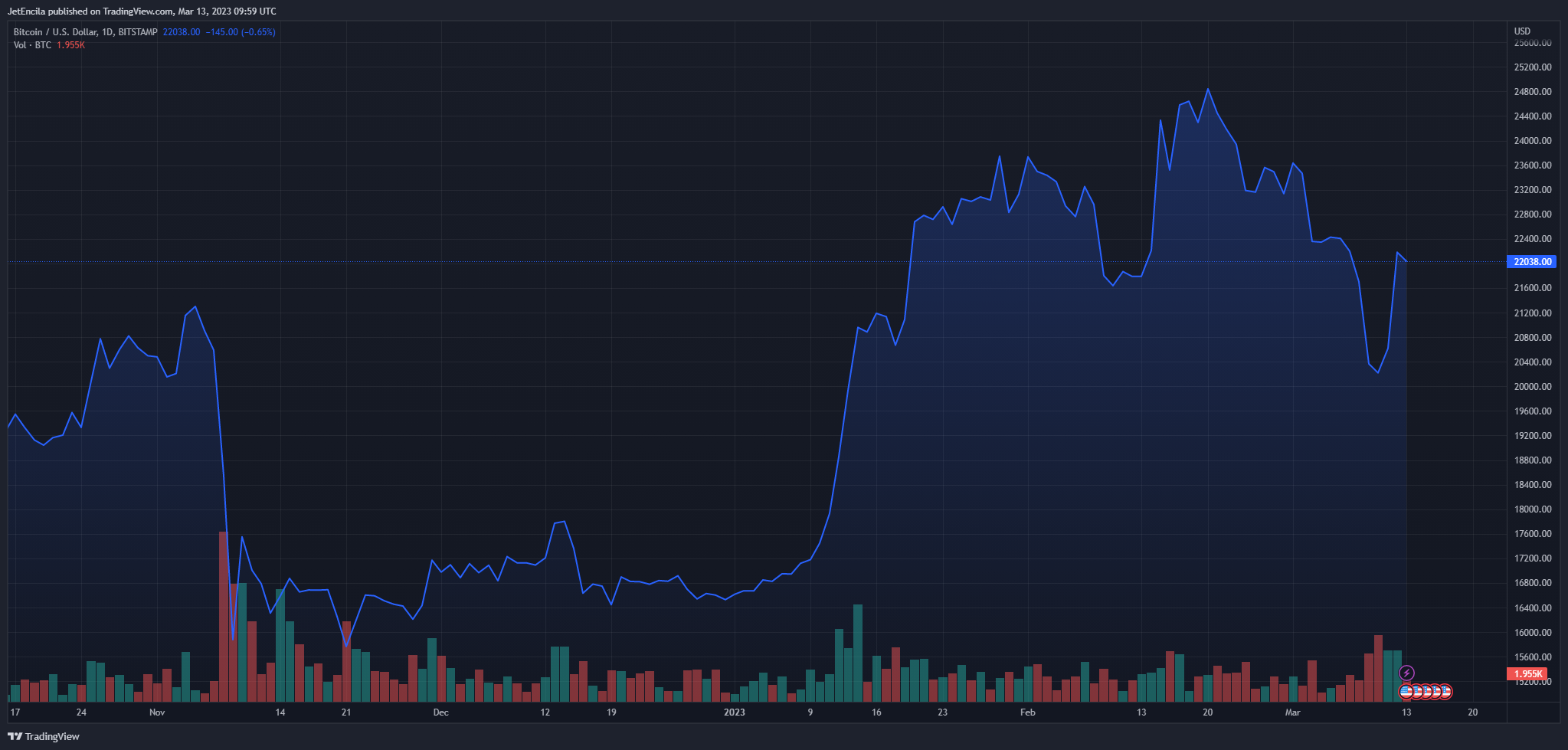 BTCUSD is up down 1.7% in the last seven days and currently trading at $22,038 on the daily chart | Chart: TradingView.com