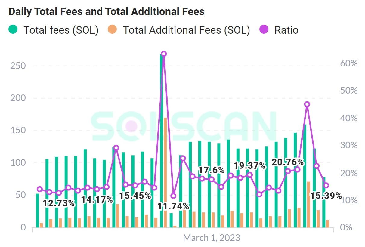 However, some transactions on the Solana blockchain incur the so-called additional fee. In the last 24 hours, the average additional fee amounted to 0.0000023 SOL, or $0.000045.