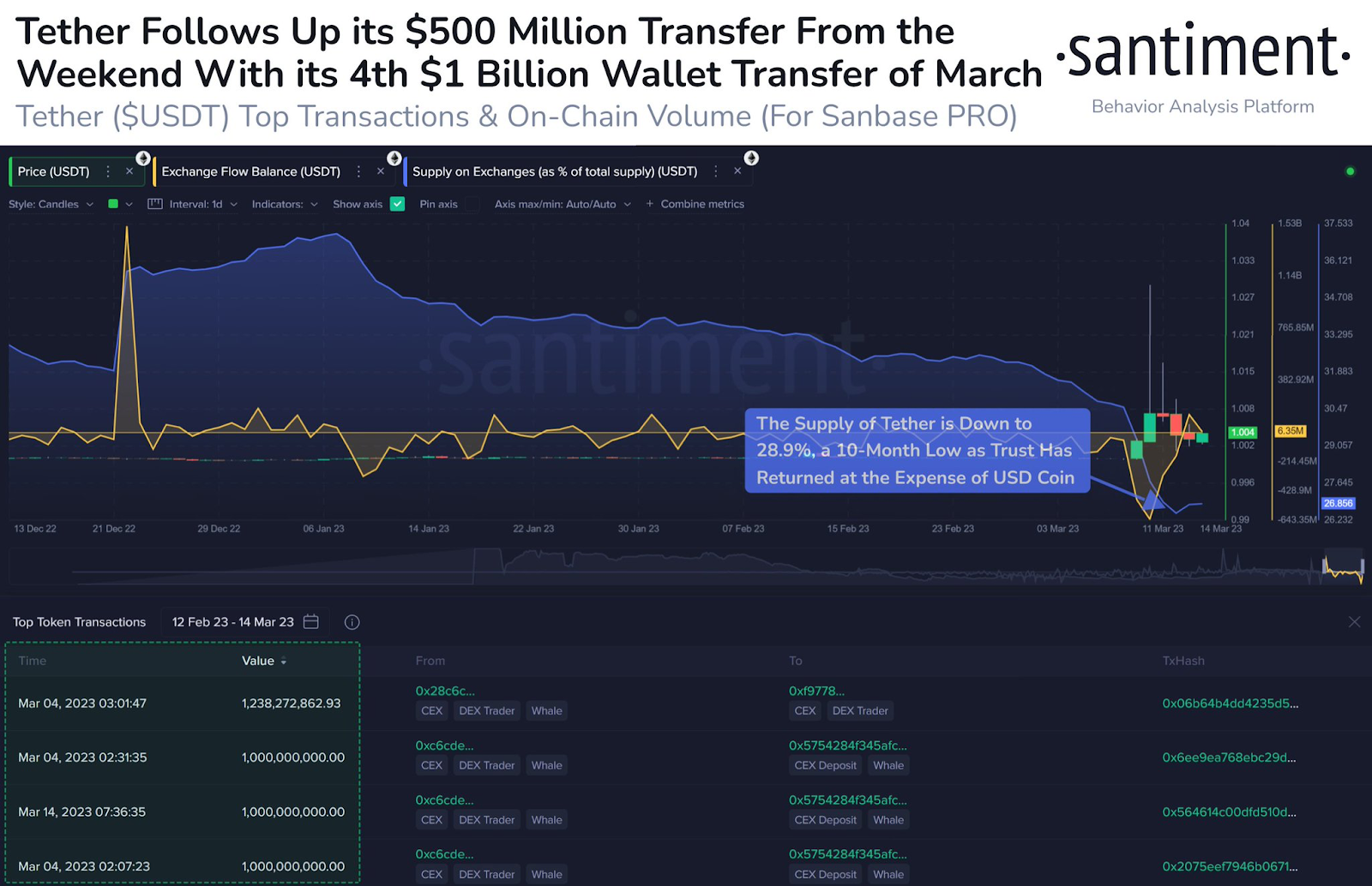 As stablecoin purchases increase, a possible market crash may be on the horizon. While the USDC stablecoin reported exposure on SVB, Tether USDT reserves were unaffected, and the company printed $1 billion in the recent past, leading to a market cap of approximately $73.7 billion.