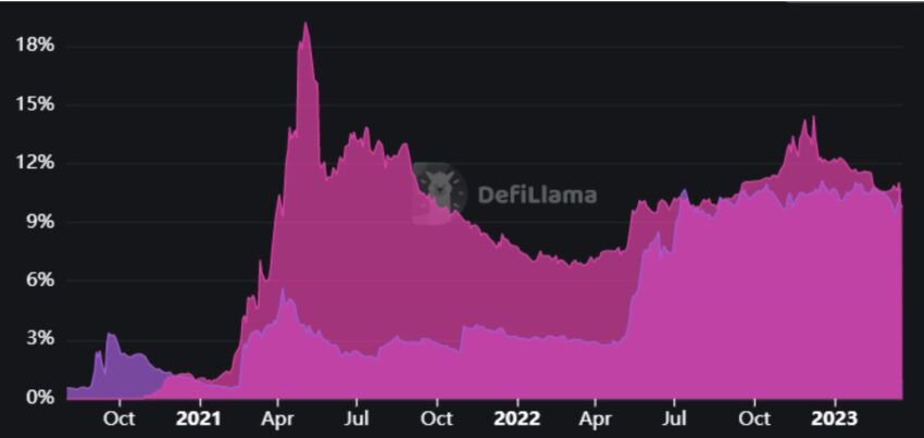 At the start of 2023, BSC maintained a decent 12% share of the TVL before TRON took over. The two chains closely tussled over the second spot in February. On March 16, BSC was the second largest chain with an 11% market share, while TRON dominated at 10%. On March 20, TRON had a market share of over 10.7%, while BSC came in third at 9.7%.