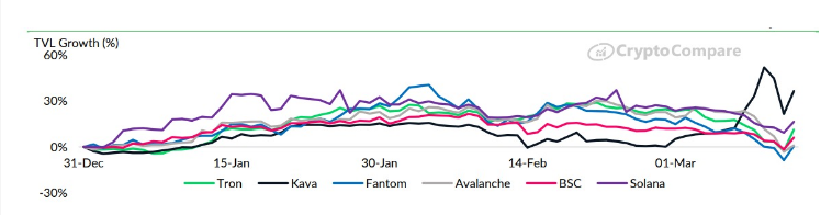 According to CryptoCompare’s latest asset report, Solana’s TVL growth is a “positive sign for the ecosystem” when compared to other blockchains, with the exception of Kava.
