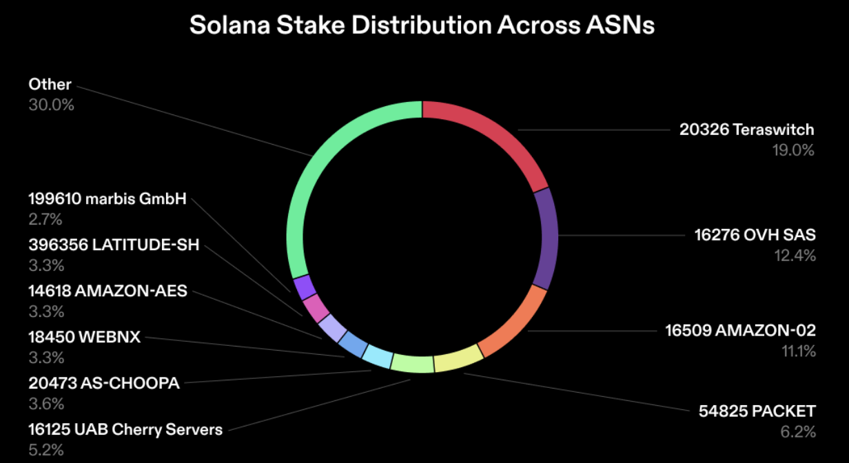 As the graphic illustrates, the Solana Stake distribution is spread evenly across ASNs (Autonomous System Number) with no autonomous system having anywhere near the 33.3% of stake needed to attack the network.