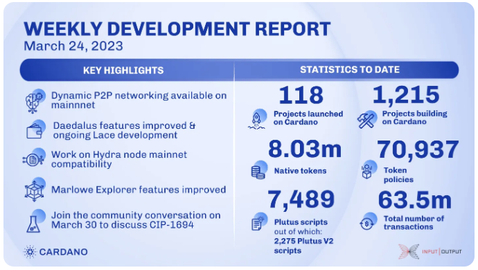 The report (which is for the week that ended on March 24) covers various aspects of Cardano’s technology, wallets and services, smart contracts, scaling, and governance. The report included an infographic highlighting various Cardano statistics, such as 118 projects launched on Cardano, 8.03 million native tokens created, 7489 Plutus scripts, 1215 projects building on Cardano, and 63.5 million transactions processed on the network.